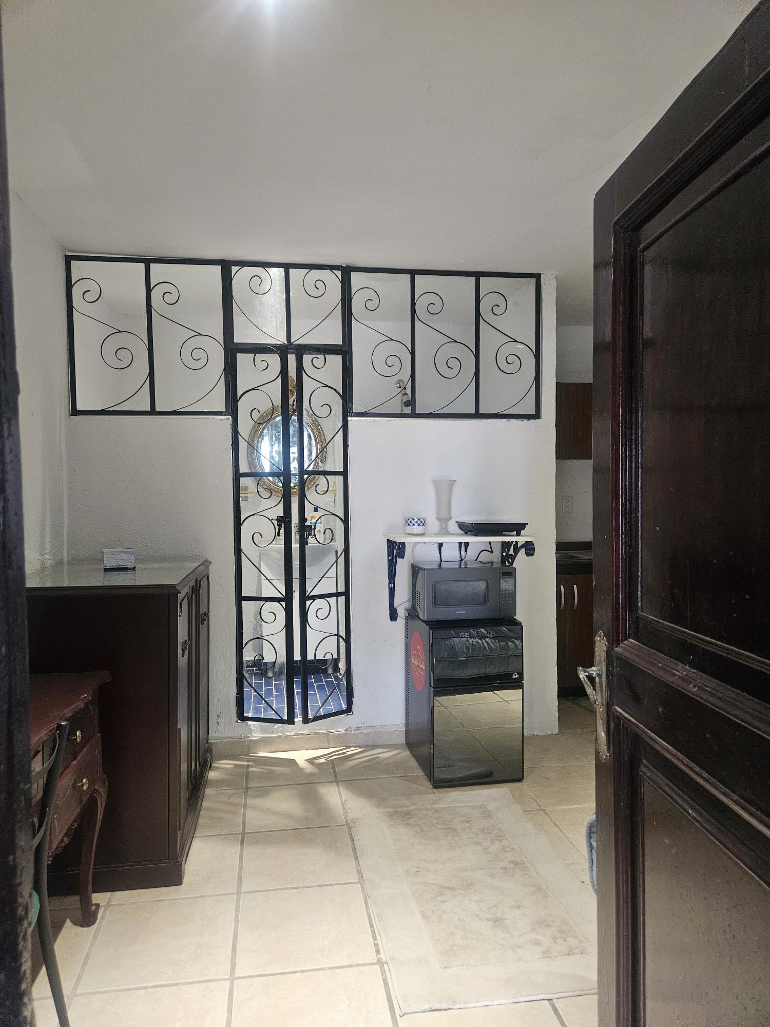 Cuenta con Habitación,cocineta, baño ( refrigerador, micro ondas, parrilla de inducción, horno eléctrico; todo esto enmarcado con detalles que dan un ambiente romántico y agradable.