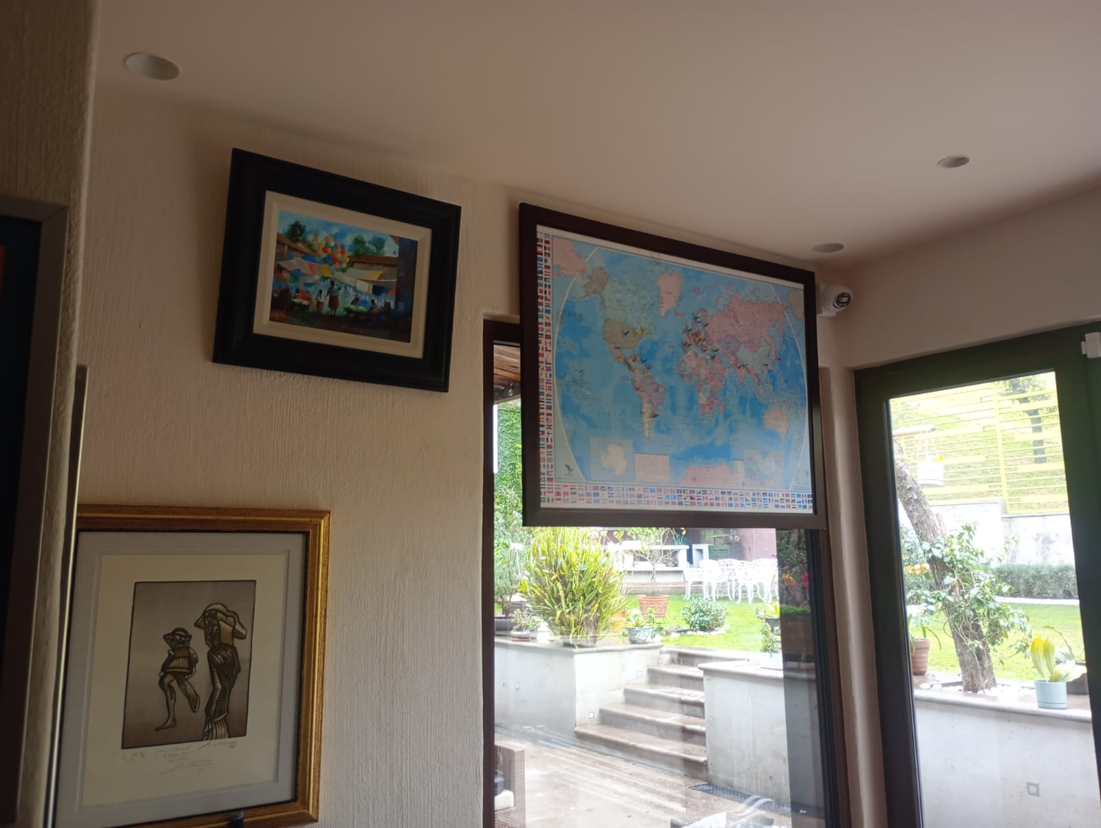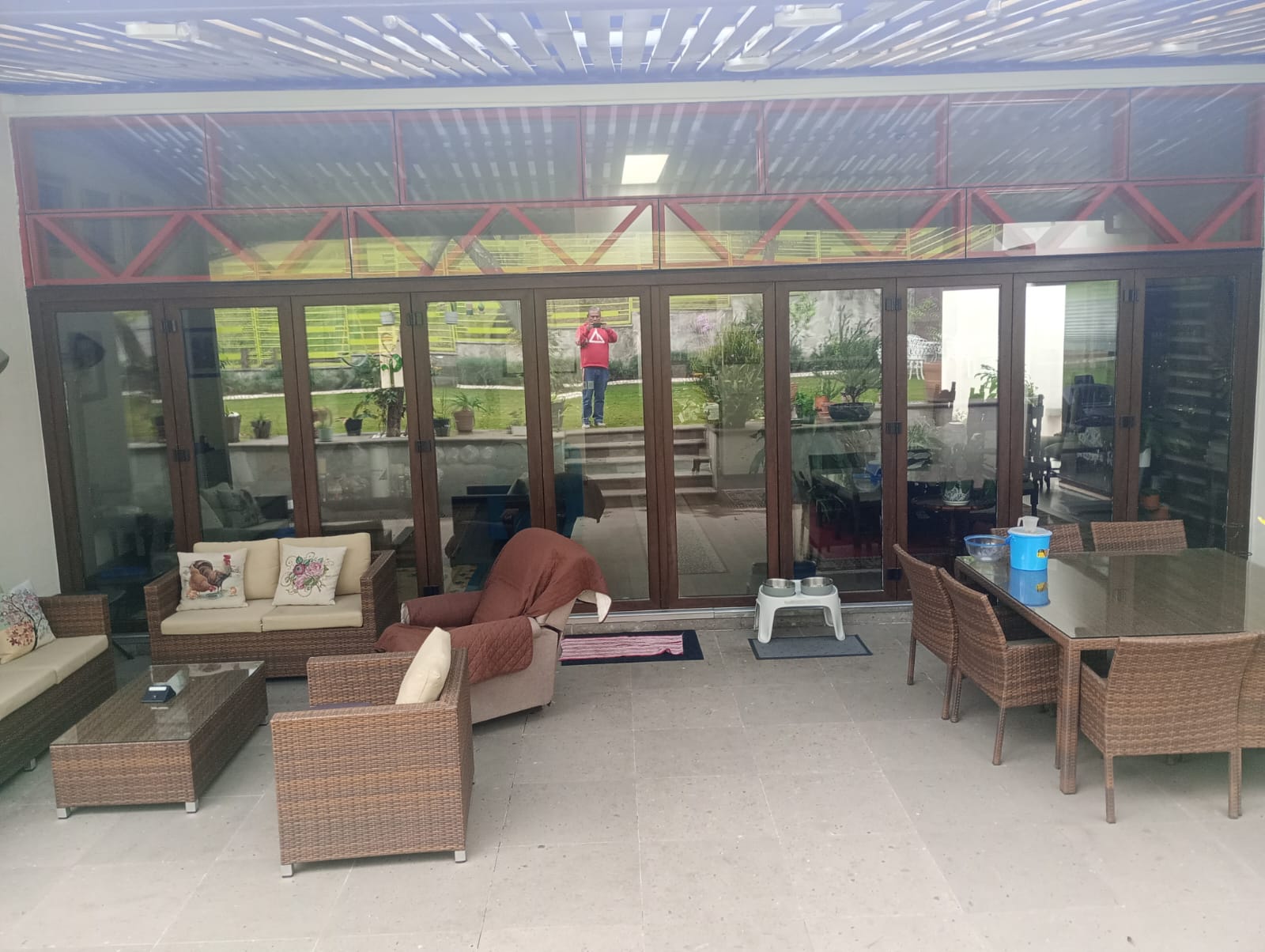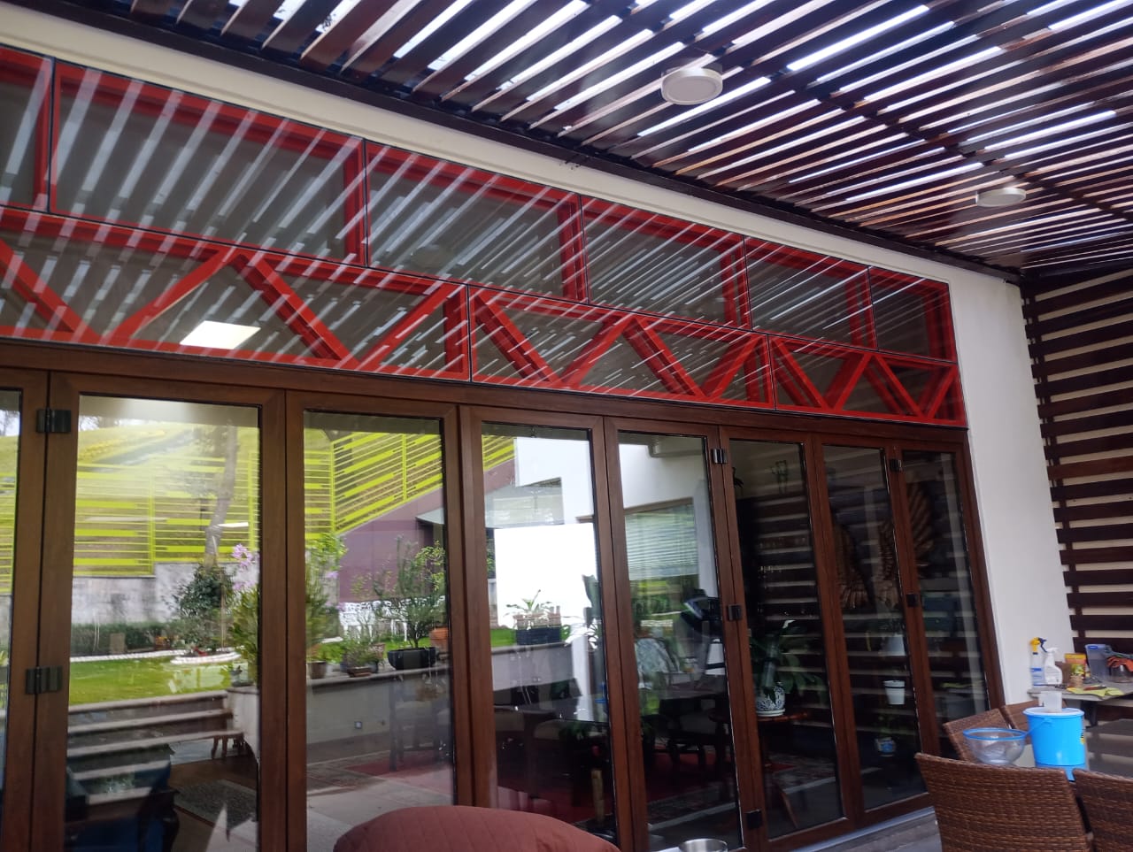 Cuenta con una espectacular terraza techada con vigas de madera y un área de lounge exterior que se fusiona perfectamente con un jardín en terrazas de diseño único.